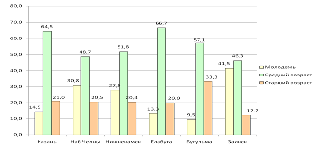 Наибольшее число респондентов (в Казани – 36,8%, в Набережных Челнах – 41%, в Нижнекамске – 42,6%, в Елабуге – 60%, в Бугульме – 33,3% и в Заинске – 39%) имеет средне – специальное образование, следующая группа по численности – высшее (в Казани – 32,9%, в Набережных Челнах – 28,2%, в Нижнекамске – 35,2%, в Елабуге – 20%, в Бугульме – 52,4% и в Заинске – 22%). Более подробная информация представлена на рисунке 2.3 и рисунке 2.4.