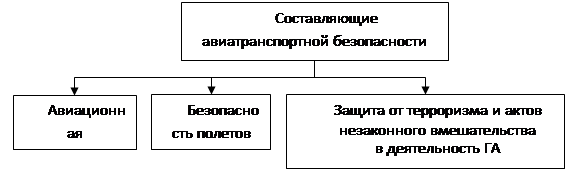 Как видно из рисунка, безопасность функционирования системы гражданской авиации страны складывается как из обеспечения безопасности в воздушном пространстве, так и в наземной области. Так, авиационная безопасность предполагает развитие системы профилактических мероприятий в наземных службах, повышение стандартов безопасности аэропортов в соответствии с международными требованиями, совершенствование системы государственного контроля за безопасностью функционирования аэропортов. Безопасность полетов – это область обеспечения безопасности, в большей мере связанная с реализацией системы мер по сохранению безопасности нахождения пассажиров и экипажа в воздушном пространстве. Отдельным направлением деятельности является обеспечение безопасности в отношении защиты от террористических и иных незаконных актов, влияющих на деятельности гражданской авиации. Эта область обеспечения безопасности предполагает проведение ряда мероприятий, затрагивающих как наземные службы, так и безопасность проведения полетов.